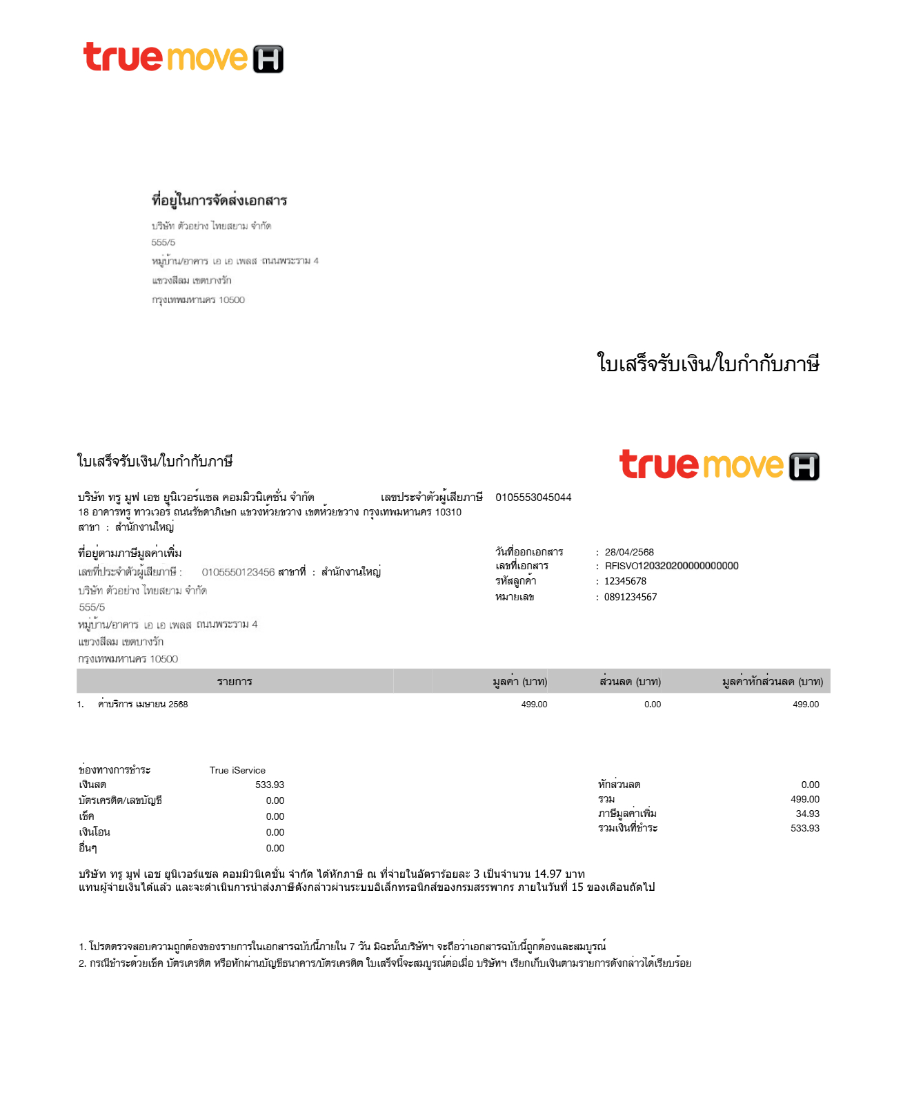 หมายเหตุ : สำหรับลูกค้าที่แต่งตั้งทรูเป็นตัวแทนหักและนำส่งภาษี ณ ที่จ่าย สะดวกยิ่งขึ้นโดยสามารถชำระค่าบริการผ่านธนาคาร เคาน์เตอร์เซอร์วิสทุกสาขา