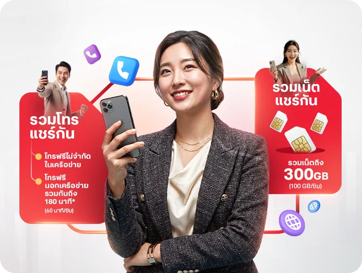 - ปริมาณอินเทอร์เน็ต (Data) และเวลาโทร (Voice) สามารถนำมารวม (Pool) และแชร์กันได้ระหว่างทุกซิมภายใต้เงื่อนไขว่า ต้องจดทะเบียนในนิติบุคคลหรือบริษัทเดียวกันเท่านั้น
